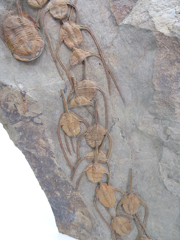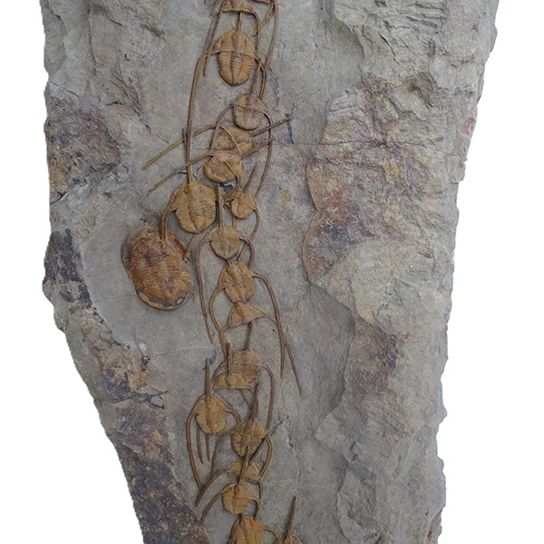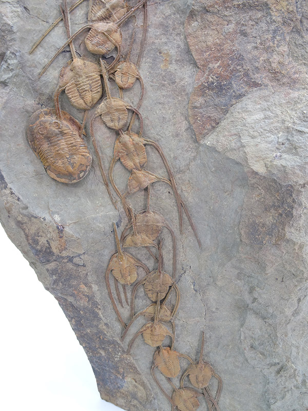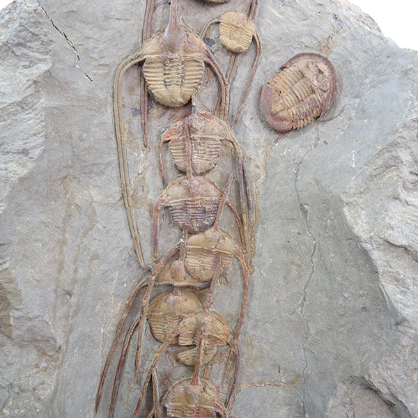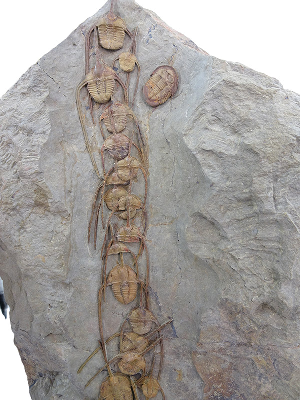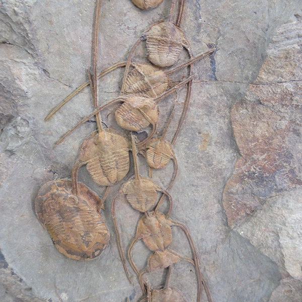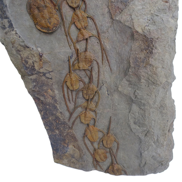 Ampyx priscus en formación lineal en lutita (roca sedimentaria de grano muy fino compuesta de partículas de arcilla y limo).