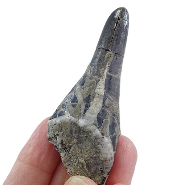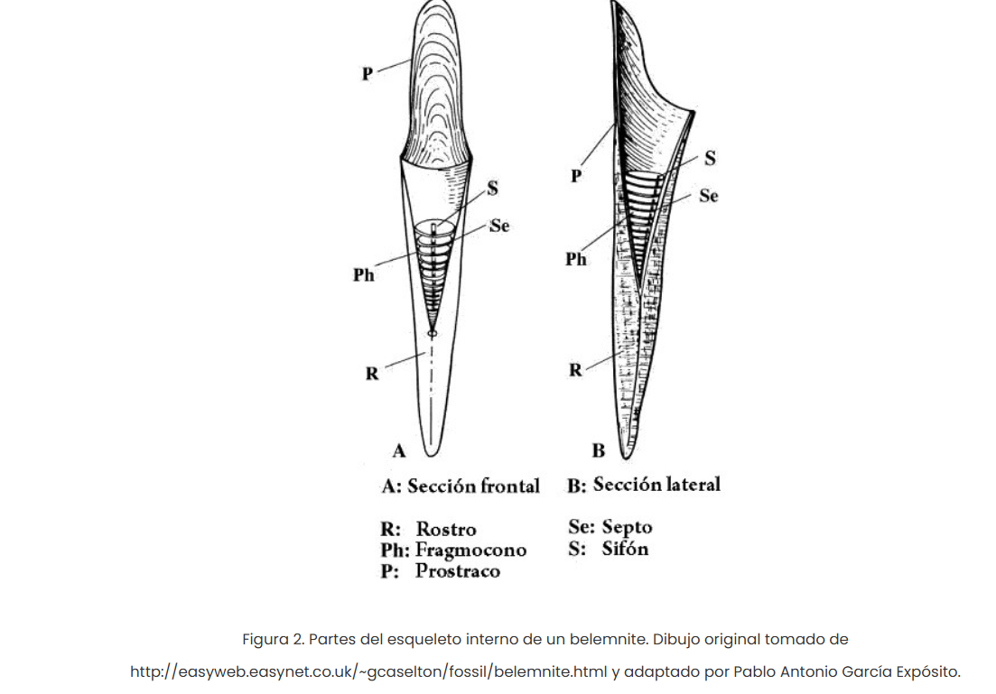 El fragmocono de los belemnites es reducido, recto y se extiende un poco más allá del alveolo. Este cono tabicado tiene los septos muy próximos unos de otros y es atravesado por el sifón. El fragmocono está formado de un mineral llamado aragonito, el mismo que forma las conchas de ammonoideos y nautiloideos, sin embargo, el rostro del belemnite está formado por mineral de calcita. Este último es más estable que el aragonito lo que explica que el rostro de los belemnites se encuentre fosilizado en abundancia mientras que el fragmocono es raro. Además, el rostro es macizo mientras que el fragmocono es mayormente hueco. En las secciones de trozos quebrados del rostro se pueden observar los cristales de calcita en posición radial y algunos anillos concéntricos de crecimiento.
