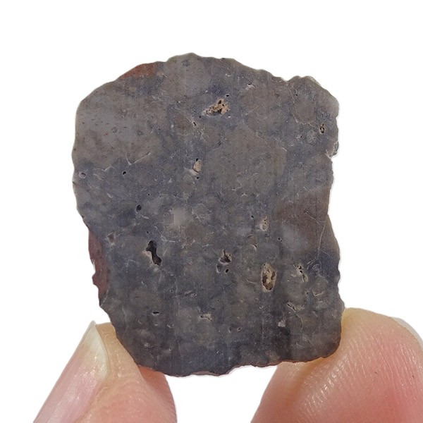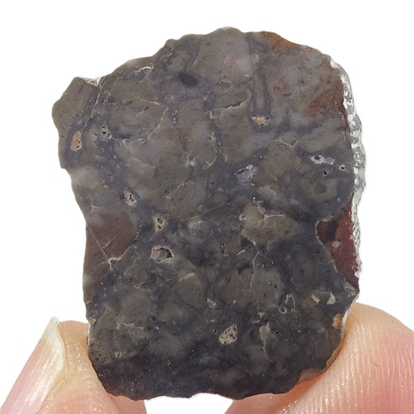 Brecha de fundido compuesta por clastos grisáceos-verdosos engastados en una matriz de roca fundida rica en anortita, que presenta texturas de flujo y temple pronunciadas, con pequeños cristales aciculares que nuclean sobre granos minerales arrastrados de mayor tamaño. Las fases principales son pigeonita, augita frecuentemente zonada y, en menor cantidad, olivino. Las fases menores incluyen ilmenita, cromita y troilita.