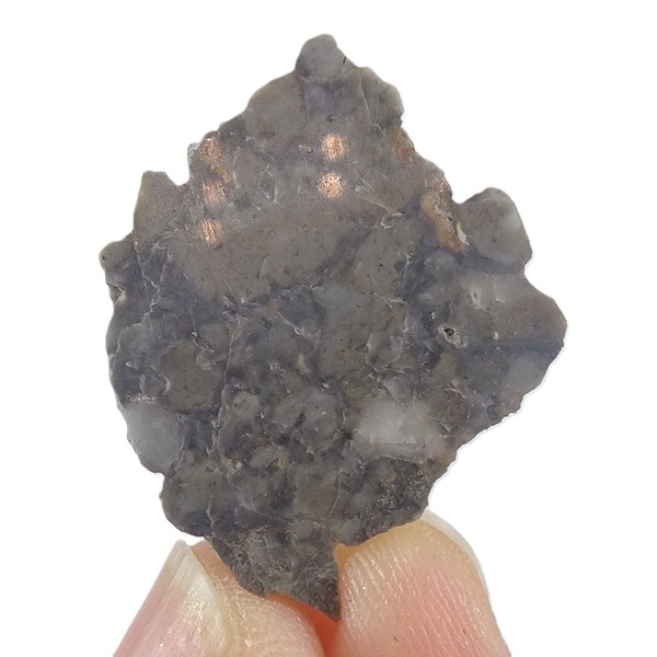 Brecha de fundido compuesta por clastos grisáceos-verdosos engastados en una matriz de roca fundida rica en anortita, que presenta texturas de flujo y temple pronunciadas, con pequeños cristales aciculares que nuclean sobre granos minerales arrastrados de mayor tamaño. Las fases principales son pigeonita, augita frecuentemente zonada y, en menor cantidad, olivino. Las fases menores incluyen ilmenita, cromita y troilita.